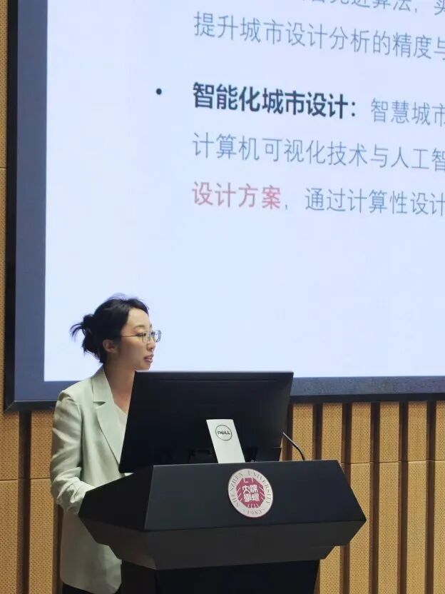 田梦助理教授代表袁磊教授团队作了题为《新城市科学背景下的人工智能与建成环境健康研究》的主题报告。该报告基于人工智能技术的快速发展和智慧城市建设的需求前提,深入探讨了新城市科学背景下团队近年来采用数智技术在建筑设计领域的相关研究成果。