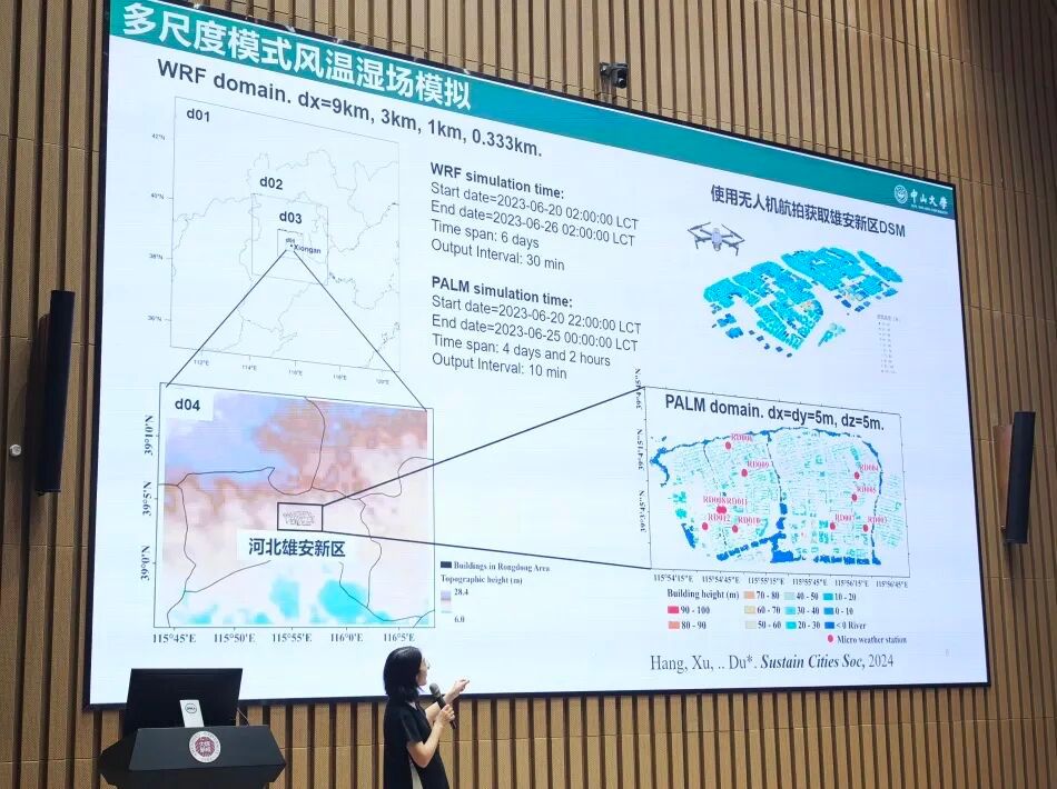 中山大学杜亚星副教授在题为《真实城市风热环境和污染物扩散数值模拟》的报告中,汇报了其在探究城市气候环境影响机理方面的研究成果。杜亚星副教授提出了多尺度风、温、湿场模拟方法,实现了对城市环境的高精度模拟。在三维城市温度场研究中,利用无人机红外技术精细还原了建筑壁温,为后续的CFD数值模拟和建筑能耗分析提供了精确的边界条件,模拟结果与实测数据高度吻合。
