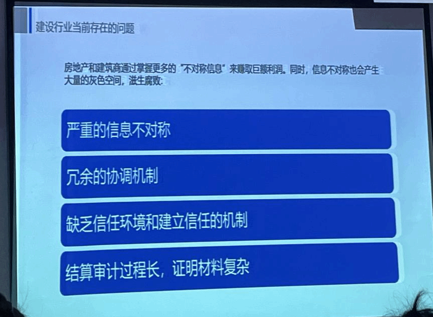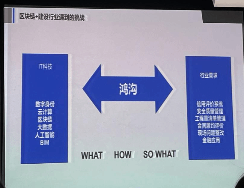 在讲座中,宋飞虎先生深入探讨了区块链技术与建设行业融合的挑战与机遇,说明了目前存在的鸿沟,其中包括IT科技与行业需求间的鸿沟。区块链+建设行业之间的鸿沟: