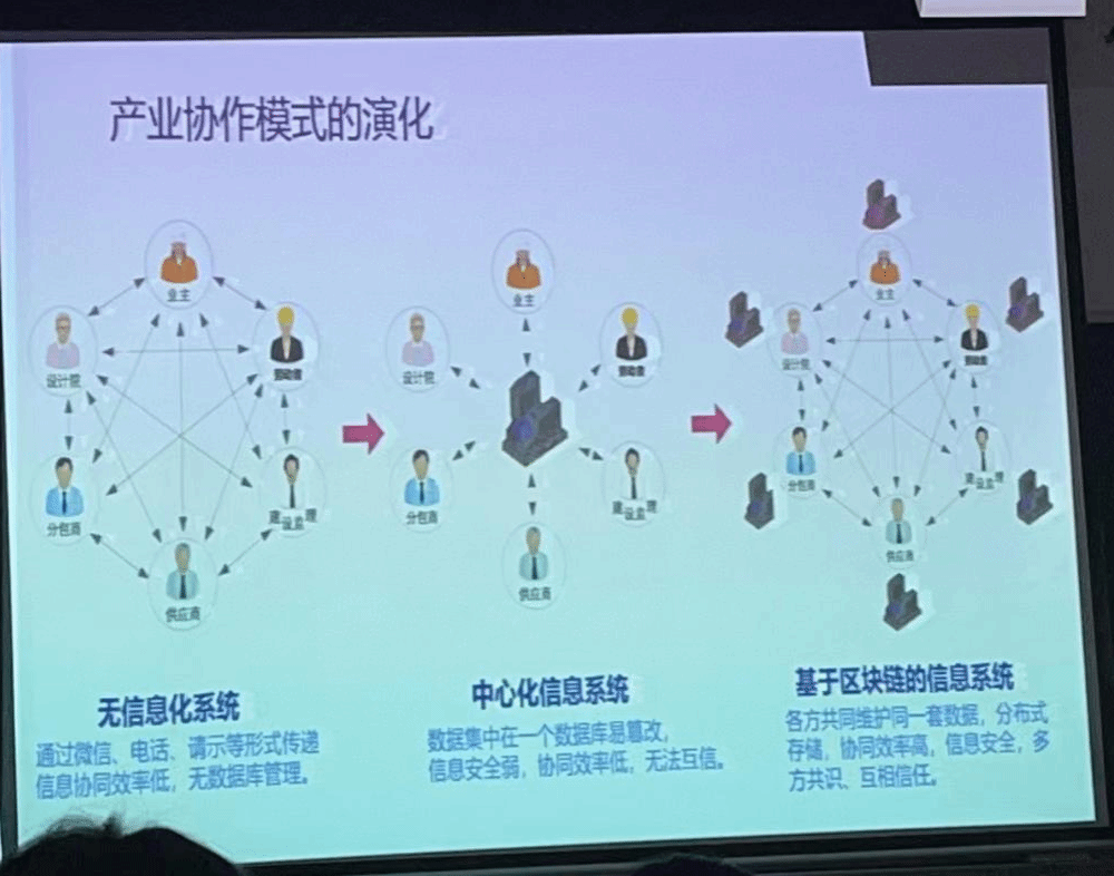 宋飞虎先生在讲座上向大家介绍了产业协作模式随着信息化技术的发展经历了显著的演化。从无信息化系统、中心化信息系统、到基于区块链的信息系统的分析。