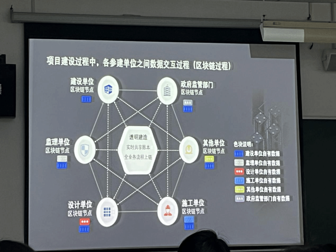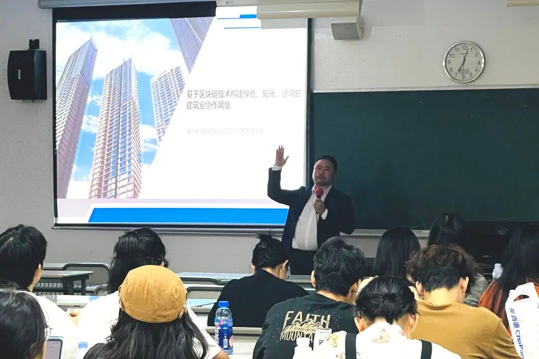 在这场讲座中,宋飞虎先生分享了对区块链技术在建筑行业应用的深刻见解和实际案例。与学生讨论了如何通过区块链技术提高供应链的透明度、优化资源分配、减少浪费,并促进可持续发展,共同探索了如何利用区块链技术来构建一个更加绿色、阳光和透明的建筑业协作网络。