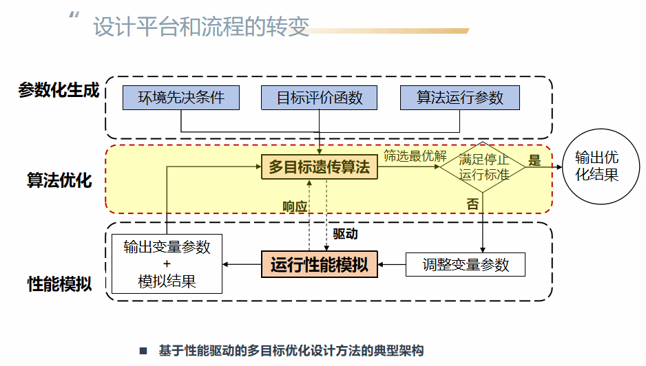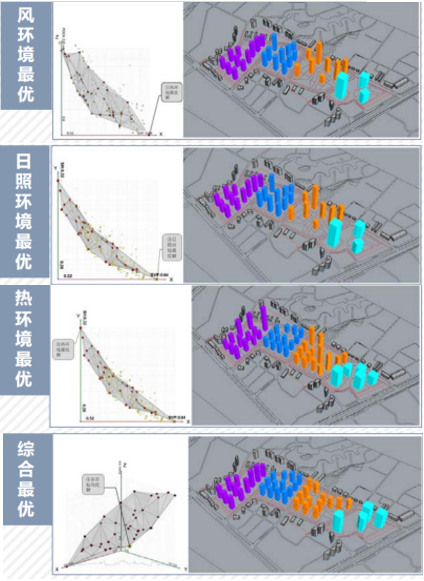 随着计算机算力的飞速发展及建成环境研究水平的不断提升,研究进入 “基于性能模拟和算法优化的设计生成” 阶段。使用者对建成环境要求提高,开始期待“一站式”的多目标优化方案,但物理环境要素间基本属于竞争关系,无法协同优化,因此项目组对设计平台和流程进行梳理和优化,在“垂直森林建筑”优化设计项目中对“热舒适、绿量、采光以及能耗”目标进行综合性优化,在“十三五”重点研发项目课题中,采用“城市布局的密度优化+地块布局的逐栋生成 ”的措施,并进一步进行了街区布局自动生成的相关研究。