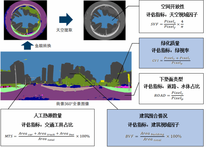 针对越来越多的城市尺度的建成环境计算需求,大尺度环境体量需整合监测站、移动测量数据等多源多模态信息,并融合机器学习模型以形成参数变量进行精确计算。在大尺度建成环境研究中团队构建了城市尺度的热舒适分布及影响要素分析框架,技术案例包括基于热辐射传输方程(RTE)法的地表温度反演技术,以及 运用深度学习语义分割模型提取街景指标,实现街区空间要素的精细识别与建筑轮廓的精准勾勒等。研究在数据整合以外也注重数据识别,借助非线性模型优化环境设计,实现了从宏观到微观、从数据到场景的全方位解析与创新应用。