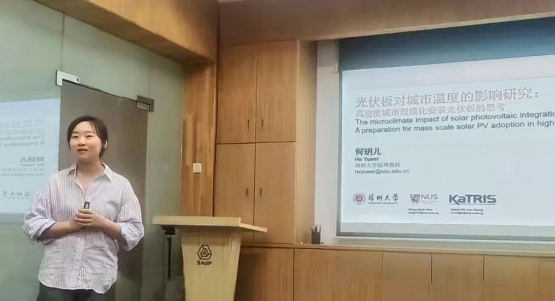 最后,深圳大学建筑与城市规划学院助理教授何玥儿博士带来了《光伏板对城市温度的影响研究:高密度城市规模化安装光伏板的思考》的汇报,她指出分布式光伏在城市中的规模化应用是落实碳中和目标的关键路径之一,不仅能增加可再生能源发电量,还可能对城市热岛效应起到一定的缓解作用。 何博士汇报了目前正在深圳和新加坡同时进行的实测研究进展,详细分析了不同安装形式下光伏板的热学特性及其对城市热环境的影响机制,并汇报了下一阶段的研究工作,旨在为城市大规模部署分布式光伏提供新的科学视角和依据。
