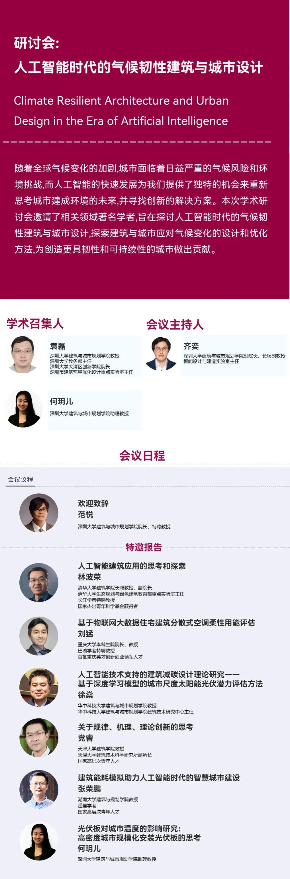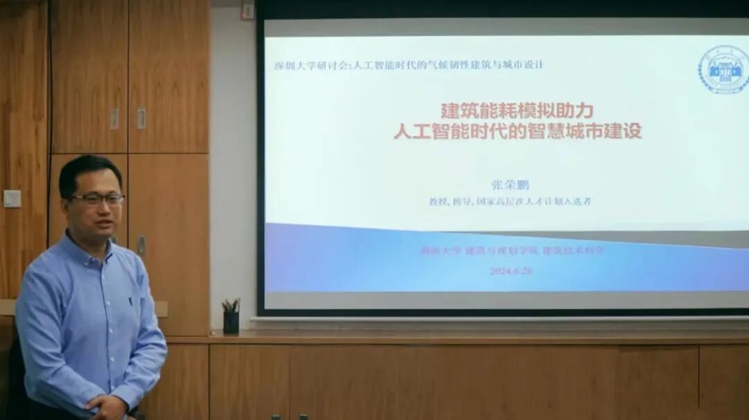 2024年6月26日,“人工智能时代的气候韧性建筑与城市设计”研讨会在深圳大学建筑与城市规划学院A103成功举办。本次研讨会由深圳大学建筑与城市规划学院袁磊教授、何玥儿助理教授组织召集,邀请到清华大学林波荣教授、重庆大学刘猛教授、华中科技大学徐燊教授、天津大学党睿教授、湖南大学张荣鹏教授。会议由深圳大学建筑与城市规划学院院长范悦特聘教授致欢迎辞,深圳大学建筑与城市规划学院副院长齐奕长聘副教授主持,学院众多师生参会交流,共同探讨如何在全球气候变化的背景下,借助人工智能技术,提升建筑和城市的气候韧性。