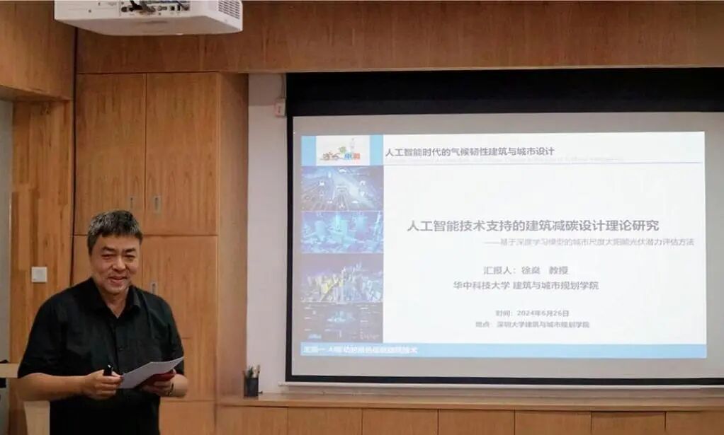 第三位特邀嘉宾是华中科技大学建筑与城市规划学院徐燊教授。 徐教授带来了《人工智能技术支持的建筑减碳设计理论研究》。 徐教授介绍了在资源约束、资源牵引以及AI驱动下,建筑设计由传统的建筑设计理论转向建筑减碳设计理论,重点介绍了一种基于深度学习模型的城市尺度太阳能光伏潜力评估方法,以快速评估城市建筑的光伏潜力,优化建筑能耗,减少碳排放,为应对气候变化和促进城市可持续发展提供了新思路。