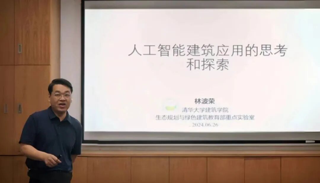 特邀嘉宾清华大学副院长、生态规划与绿色建筑教育部重点实验室主任、教育部长江学者特聘教授、国家杰出青年科学基金获得者林波荣教授,带来了《人工智能建筑应用的思考和探索》的专题报告。
