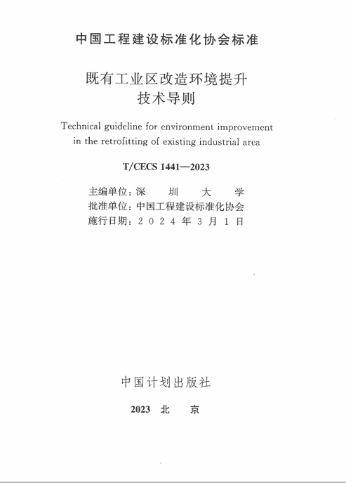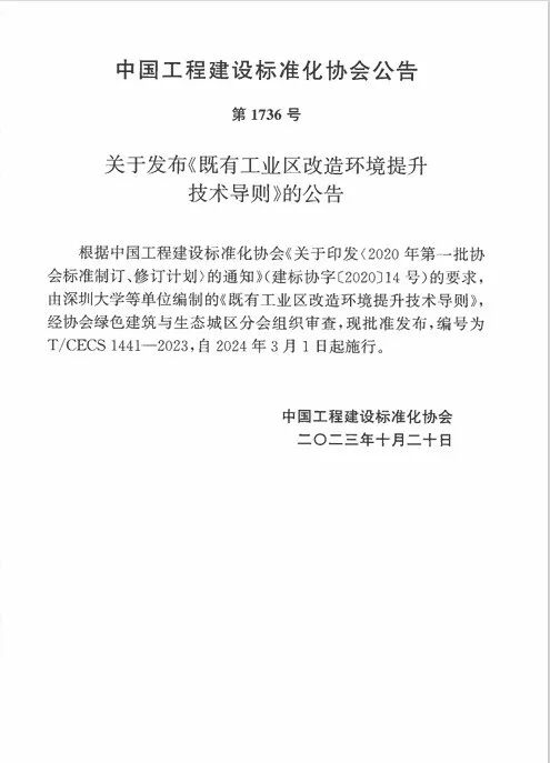 中国工程建设标准化协会标准《既有工业区改造环境品质提升技术导则》(T/CECS 20013-2023)(以下简称导则)由深圳大学牵头,袁磊教授领衔主编,经由绿色建筑与生态城区分会组织审查后,于2023年10月20日正式发布,并于2024年4月1日正式开始实施(图1,2)。