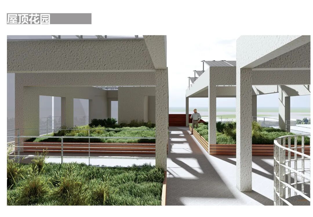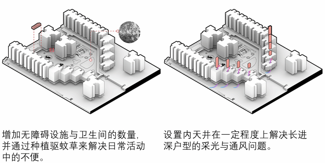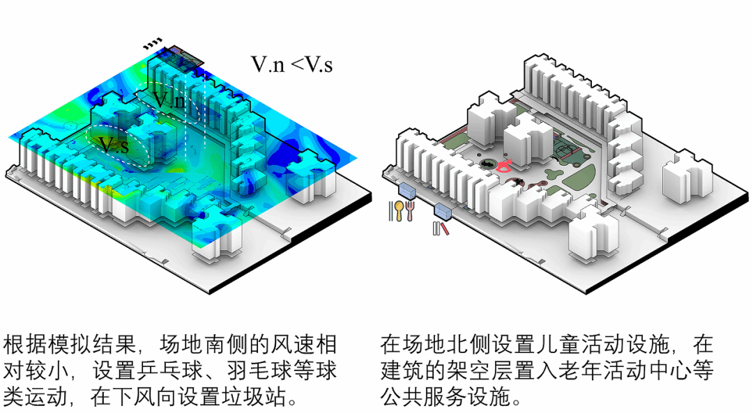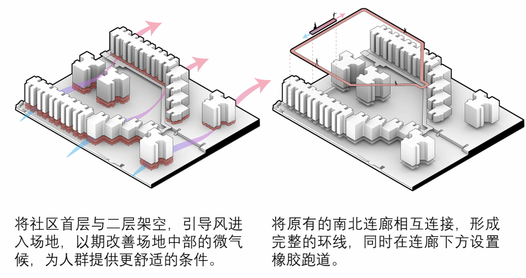 方案将首层与二层架空,结合内部庭院完善社区的公共服务空间,同时给场地引入自然风改善场地的内部微气候,并基于数值模拟给室外功能布局提供优化建议。针对两类户型进行方案优化,设置内天井与穿堂风风道能在一定程度上解决长进深户型的采光与通风问题。基于原有的退台屋顶设置组合式阶梯绿化形成屋面景观,退台的尽头恰好能与原有二层连廊连接,将公共空间从地面层逐步过渡到屋面层。