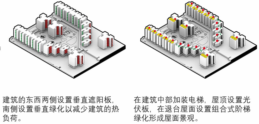 增设南、西向外挑廊,结合垂直绿化和屋顶花园,减少围护结构得热;