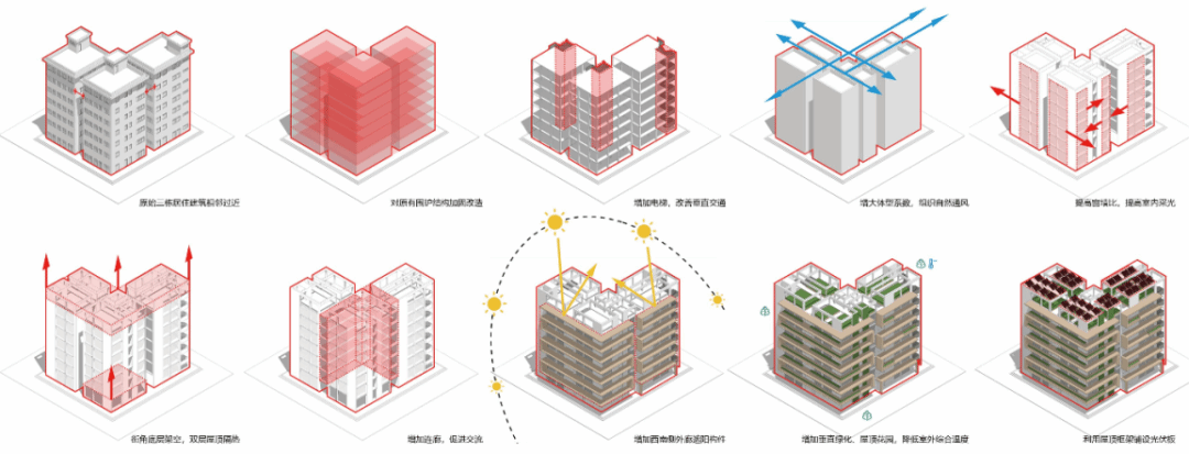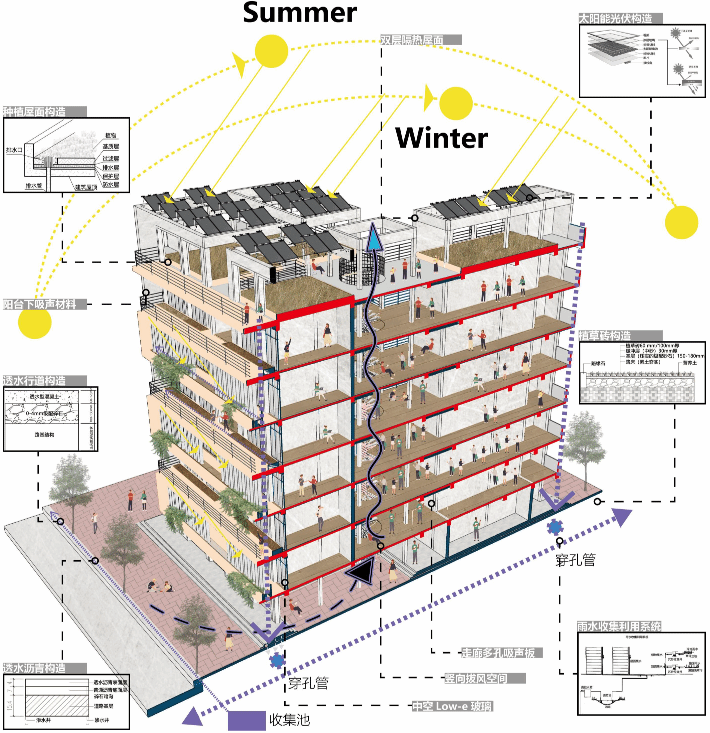 本次设计以单体建筑改造作为切入点,以桂庙新村中心地段的三栋户型及结构类似的7层住宅为单体设计对象,构思将三栋单体居住建筑改造连接为一栋办公建筑。绿色目标包括了超低能耗建筑、职住融合的绿色生态社区以及实现低冲击开发满足海绵城市要求的三大改造目标。