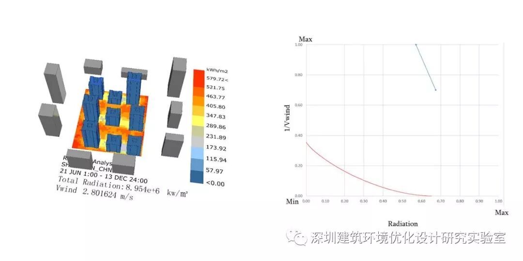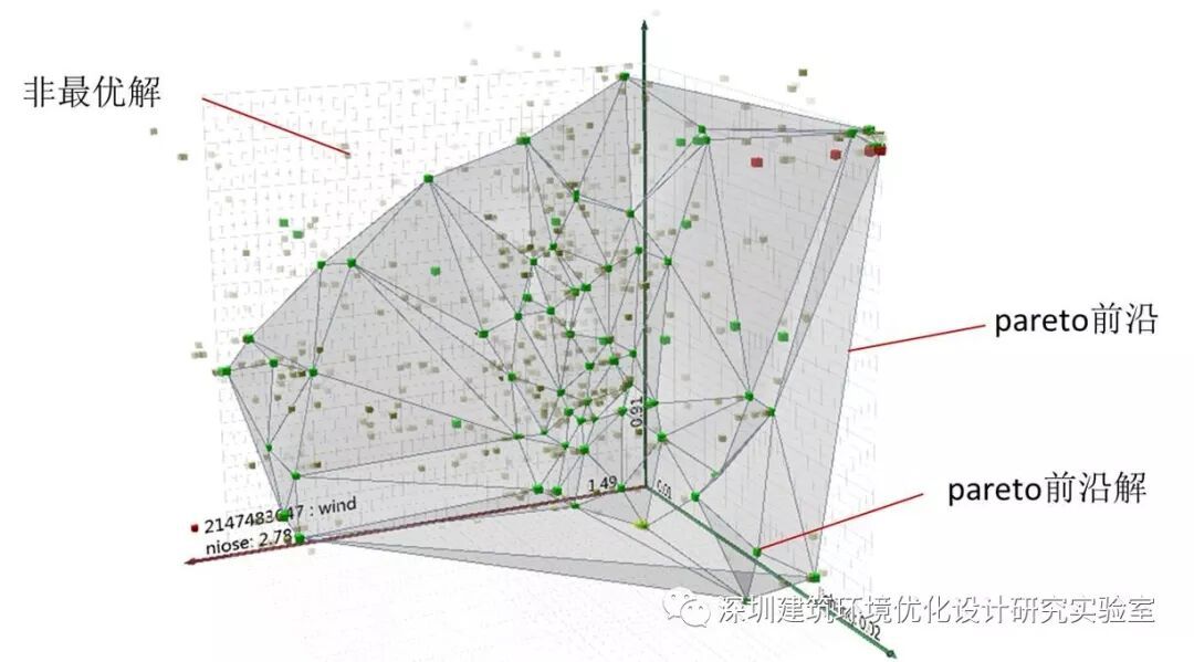 建筑性能预测(及模拟)作为建筑设计过程不可缺少的环节,需要考虑风、热、采光等物理环境要素,以及容积率、景观均好性等其他经济和社会要素,因素较多且相互制约。 本研究将规范转换为设计要求的算法,将不同的设计影响因素转换为不同强度层级的目标进行寻优计算,生成建筑最优解。多目标优化问题一般不存在一个最优解,所有可能的解(非劣解)构成了一个最优解集(最优域),也称为Pareto解。在报告中崔冬瑾博士以小区风热环境优化布局求解和深圳某办公楼项目建筑单体作为案例,演示了建筑多目标寻优的操作和成果。