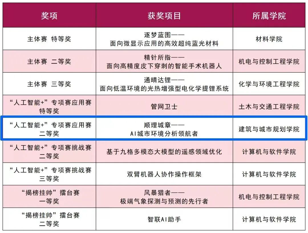 建筑环境与优化重点实验室的研究生团队钟国栋、袁之雨、梁倩瑜、张海菀、高慧、王璨、国润秋、唐穗希、黄晓敏等在许雪松、田梦等实验室老师团队的指导下,以“顺理城章——AI城市环境分析领航者”项目代表深圳大学在本届“挑战杯”决赛中脱颖而出, 获第十九届“挑战杯”全国大学生课外学术科技作品竞赛 “人工智能+”专项赛应用赛 国家级 二等奖 !